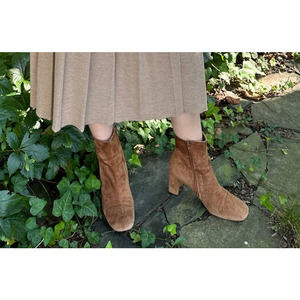 Super versatile MNZ ankle boots, in a baby soft and velvety auburn suede. Suede covered square heel, lightweight, leather insole and outsole, perfectly curved toe. Great with jeans or with a dress. This pair is in good pre-owned condition. Retailed for $725.
