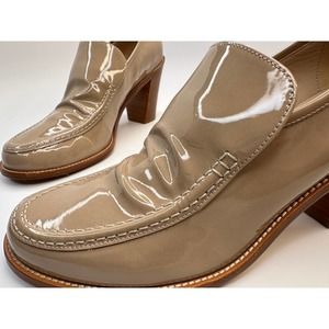 Elegant beige heeled loafers. Sleek design with a sturdy block heel. Perfect for any occasion. Fits a US 9.5 perfectly.