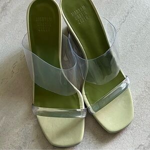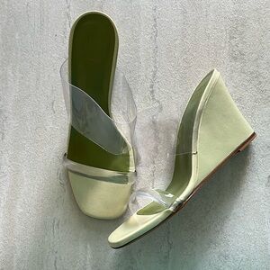 High wedges with two clear perspex bands. 8cm heel. Fits true to size.