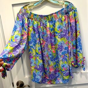 Light and bright. Off the shoulder top. Size Large. NWT. Lilly Pulitzer. 100% polyester fabric - not sheer but very light weight fabric.
