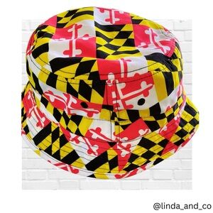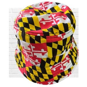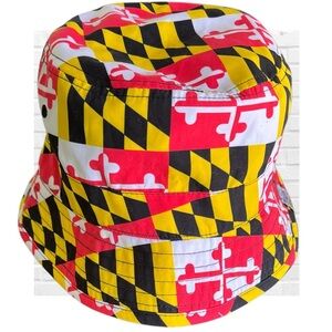 Vibrant bucket hat featuring the State of Maryland flag design. Show your Maryland pride when you’re out and about this summer wearing this great hat. It is bright and colorful It is new without tags. Adult size one size fits all.