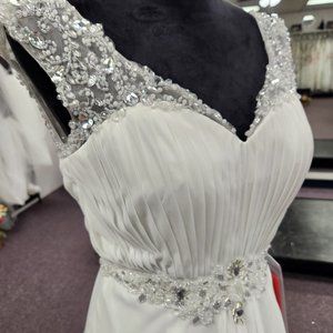 A-line chiffon bridal gown with V-neck and low V-back, pleated bodice, lace and rhinestones on shoulder straps and waistline, and back zipper.