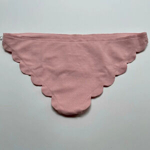 Features a low rise and signature raw edge scallops to trim the legs and hips.