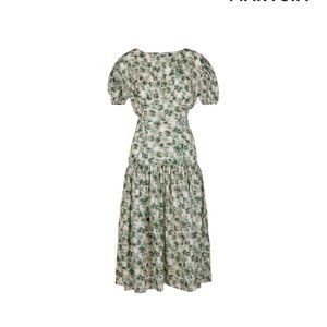 Puffed short sleeves and a flattering cinched waistline, with ruched detailing throughout, accent this midi-length dress. In our seasonal Sea Urchin Green Print.