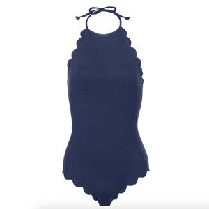 Elegant navy one piece with scalloped edges. High neckline. Perfect for a chic beach look.