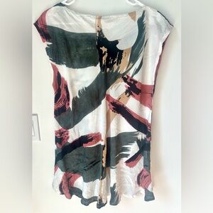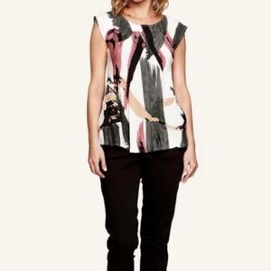 Stylish sleeveless top with abstract design in pink, black, and white. Paired with classic black pants.