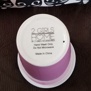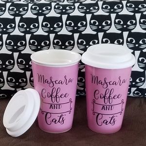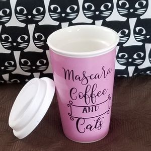 NWOT Purrrfect for the diva! Mascara, coffee and Cats. Pretty ceramic pink color with black print & some gold accent with white silicone lid.