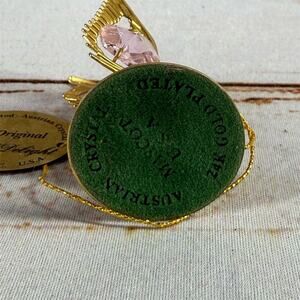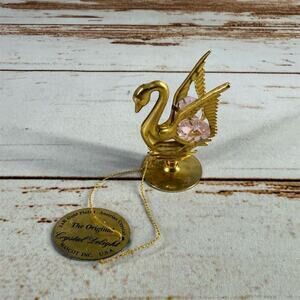 This exquisite Mascot figurine captures the elegance of a swan, beautifully crafted with 24K gold plating and adorned with sparkling Austrian crystals. Standing at 2.5 inches tall, this vintage piece from the late 20th century exudes timeless charm. Its gold hue and intricate detailing make it a stunning addition to any collection or a standout decorative piece for your home. Complete with its original tag, this swan figurine is a testament to vintage artistry. Pre-owned, it carries a touch of history and character, ready to grace your space with its graceful presence.