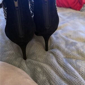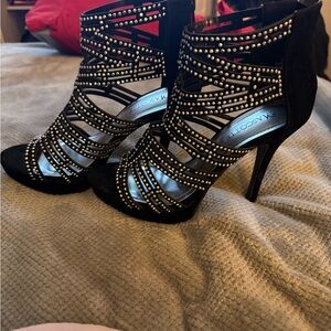 Step into elegance with Mascotte black and silver heels, featuring a chic stiletto design. The strappy bands are adorned with geometric silver studs, creating a captivating look. Ideal for formal events, these heels offer a perfect blend of style and sophistication. Heel is 4”