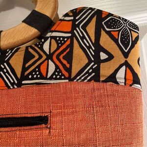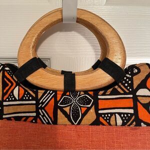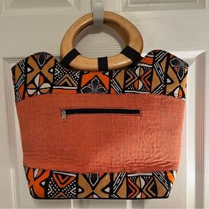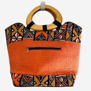 Elevate your style with this vibrant orange & navy patterned tote. The wooden handle adds a distinctive touch, perfect for any occasion. In New Condition!