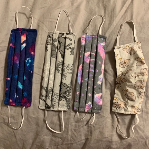 There different design color masks fits all size. Expect the elephant one may fit smaller face. The first 3 never used them the elephant one I have used but it’s been cleaned