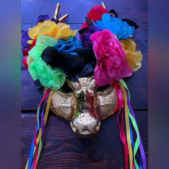 a beautiful deer mask with flowers and ribbons
