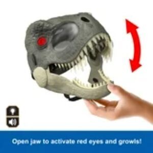 This Tyrannosaurus rex mask is sure to thrill any Jurassic World fan with its appearance straight out of Jurassic World Rebirth and 3 levels of Rage 'n Roar effects! With authentic movie design, this Tyrannosaurus rex mask is intimidating even in its "resting" state – with ferocious teeth, blinking eyes and soft growl sounds. The light-up eye effects increase with three levels of aggression and increasingly fierce growls as the jaw is opened! It's fierce, it's fiercer, watch OUT! This role play mask will light up any Jurassic World fan 6 years and older. Eye and mouth openings provide easy wearability and an adjustable strap provides a secure fit. Colors and decorations may vary.