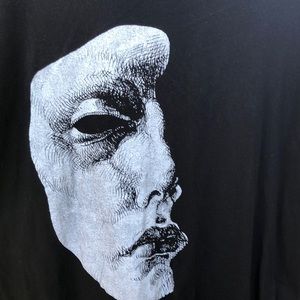 Black tee with original half face design by Rotten Fantom. Pre-worn but design looks great.