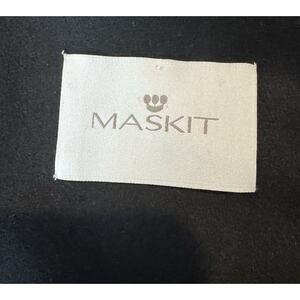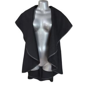 The Maskit of Israel Cashmere Wool Leather Desert Coat in black is a stylish and versatile vest designed for women in size medium. Made with a luxurious cashmere blend outer shell, leather piping, and belt this wrap-style vest is perfect for layering in colder weather. With features like a hood and an open design, this piece combines practicality with a touch of elegance, making it a must-have addition to any wardrobe. Designed and crafted in Israel, this vest offers a blend of quality and sophistication. Leather trim.