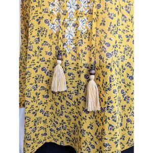 Mason & Belle Mustard Yellow Blue Floral Print Flowy Boho Embroidered Peasant Top. 3/4 sleeves. V-Neck. White embroidery. Tassels. High low styling.