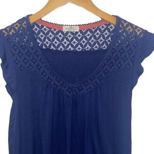 Mason & Belle Womens Lace Yoke Ruffle Detail Knit V-Neck Rayon Blend Davina Top Navy Small