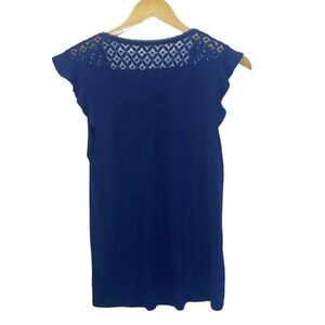 Mason & Belle Womens Lace Yoke Ruffle Detail Knit V-Neck Rayon Blend Davina Top Navy Small