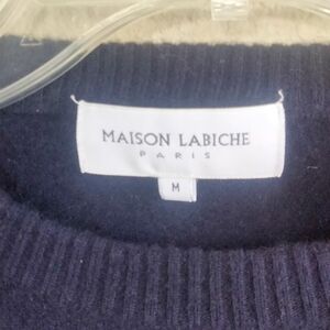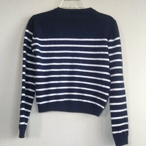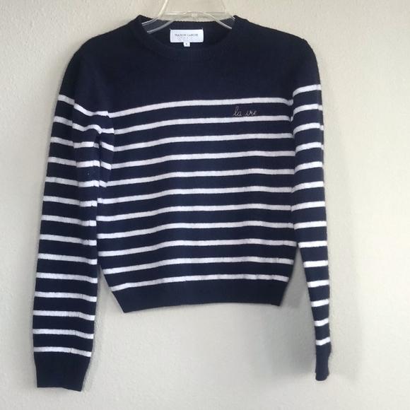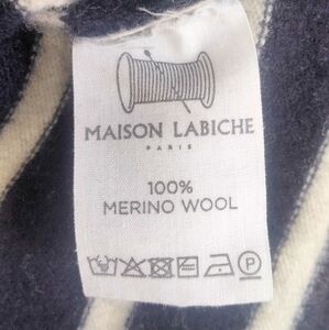 Embrace timeless style with this Maison Labiche size medium sweater, featuring a classic blue and white nautical stripe pattern. Crafted in a comfortable knit material, this crew neck design offers a preppy look perfect for any casual occasion. The evenly spaced stripes add a touch of elegance to this versatile wardrobe staple. 100% merino wool, super soft!