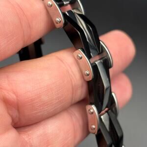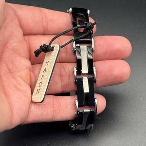 Mason Parker’s men’s bracelet delivers a bold, architectural design with two-tone stainless-steel links in gunmetal and brushed steel shades for a contemporary, versatile look. The alternating link design blends angular and fluid elements, creating a structured, masculine presence while maintaining a refined silhouette that suits both casual and dress styling. The heavy stainless-steel construction offers solid weight and durability, and the integrated clasp ensures a secure, comfortable fit for everyday wear.