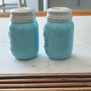Mason Jar Ceramic Salt and Pepper Shakers in turquoise and white. Each shaker is labeled with cursive lettering. Cute vintage salt and pepper shakers for everyday use and all of your backyard celebrations! Great in coastal, farmhouse and retro decor.