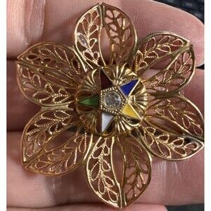 Masonic Eastern Star Enamel Brooch Pin Rhinestone Filigree Gold Tone Vintage