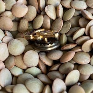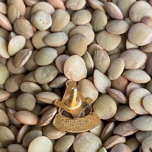 Super interesting lapel pin that is bound to collect some gaze during conversation. Stamped sterling silver on the back, my guess is that it is electroplated with gold but haven’t bothered testing. Diamond accent at the axis. Pin is a bit smaller than a dime.