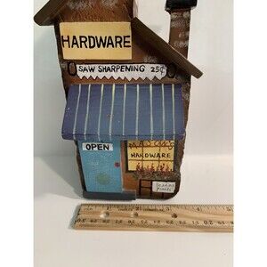 Masons Country Hardware Store Building Villag Figure Toy Covered in Signs. A charming rustic country hardware store with open sign. Features signs posted all over about saw sharpening, hardware, garden plants and supplies and cold drinks. Some wear and imperfections consistent with age and use, please view all photos closely. There is a sticker on the bottom but it's unreadable. Not sure of the material, it's not wood.