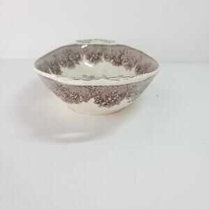 A beautiful example of English transfer ware, this oval vegetable serving bowl could be used at your next dinner soirée or simply as an accent piece on a sideboard. The brown Ascot pattern is a pretty floral pattern with accents of green, yellow and light brown.
