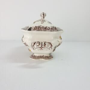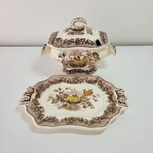 A beautiful example of English transfer ware, this small lidded sauce boat/tureen and underplate set could be used at your next dinner soirée or simply as an accent piece on a sideboard. It would also look great holding flowers or a potted plant. The brown Ascot pattern is a pretty floral pattern with accents of green, yellow and light brown.