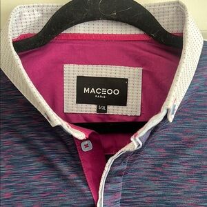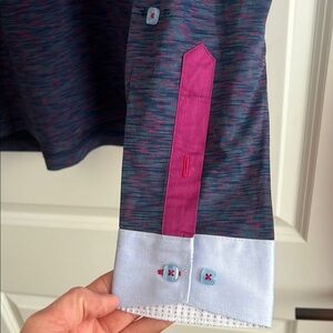 Elegant Masood long sleeve polo shirt. Features a navy and magenta pattern with contrasting collar and cuffs.