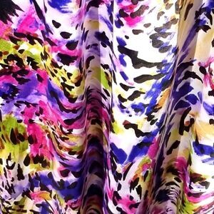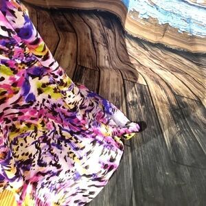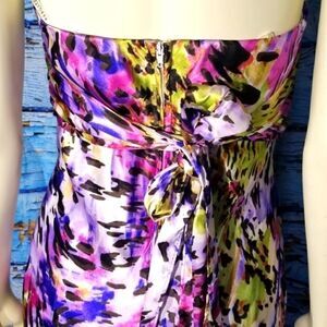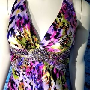 Beautiful color splash pattern. Size 7/8 may have been altered 17 ' armpit to armpit 14" waist60" long in front. Back is 64" long. Has some tanning markings inside as pictured. Halter style top. Rhinestones and beading.under bust area. Perfect for prom.