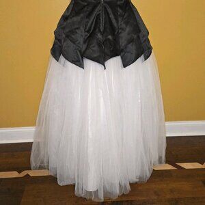 Turn heads in this striking two tone strapless gown, lending a sleek balck sain bodice with a layered white tulle skirt.