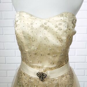 Poofy strapless cream dress. Bodice has embroidery and silver glitter and a sown in broach. No stone missing, no stains, no makeup stains on the inside. Very pretty. Worn as bridesmaids dress.
