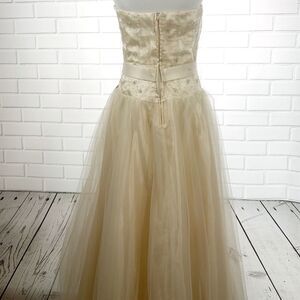 Masquerade Cream Strapless Sequin Ballgown - Size 13/14. Excellent condition no flaws. Measurements are shown in the 9th - 11th photos.
