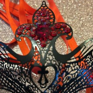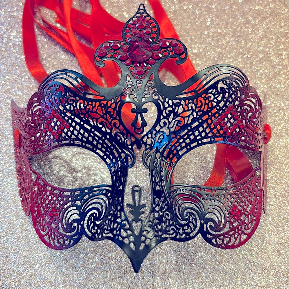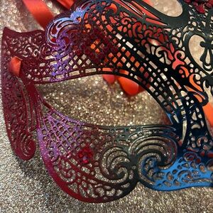 Metal and Swarovski crystal masquerade mask. Purchased in New Orleans over 20 years ago and it's ready for its new home. The metal is a black and red finish. The crystals are all red. Beautiful detailing comes with the satin ribbon to tie.