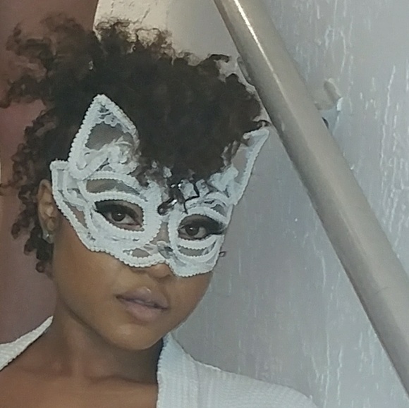 White lace and clear Kitty mask with diamonds. Perfect for a masquerade or just a little fun.