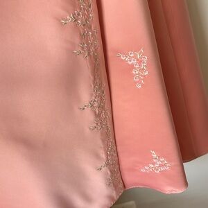 Masquerade Strapless Full Length Gown Dress in color Coral Pink in size 5/6. This item is in Gently Used condition. Small single stains on the bottom front and back of the dress. The dress has been dry cleaned and ready for a new home. Absolutely breathtaking dress. The photos doesn't do it justice. -Strapless with embroidered band folded over. -Wrap style full skirt with embroidered design down the border and on the inner skirt as well. -Embroidered design are small pink flowers with green petals and a bead/sequin at the center of each flower. :Ruching at the left side. -Zipper with eye/hook closure on back Measurements laying flat: Full length: 49.5" Chest: 13" Waist: 11.5