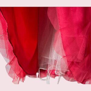 This stunning red gown features a strapless sweetheart neckline, ruffled skirt, and eye-catching rhinestone embellishments. Ideal for prom or formal events.