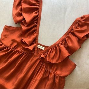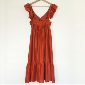Gorgeous deep orange silk dress with ruffled shoulder straps and a gathered midi length hem. Loose breezy style, invisible zipper on the side. The lightweight 100% silk fabric has an amazing shine and a subtle silk texture, unlined.