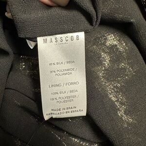 Introducing the luxurious Masscob Black and Gold silk V-neck dress in size large, expertly made in Spain. This dress is the epitome of elegance and comfort. Crafted with a blend of black and gold silk, it exudes sophistication and style. With a chest measurement of 33.5" and a waist measurement of 28", it flatters your figure beautifully. The total length of 41" adds a touch of grace and versatility. Whether you're attending a special event or simply want to feel fabulous, this dress is the perfect choice. Embrace comfort and style with the Masscob Black and Gold silk V-neck dress and make a lasting impression.