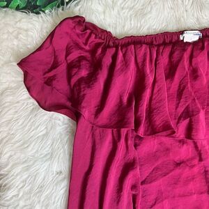 Tags: party, special occasion, event, work, school, holidays, Mother’s Day, plus size top blouse, pink down the shoulder off the shoulder, cold shoulder, cute, nice elegant, classy, ruffled, sateen style, shimmery, woman, vacation going out