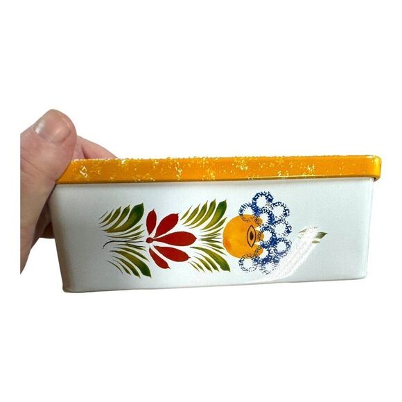 Store your treasures in this vintage tin box with a whimsical folk art design. Perfect for hiding your secret candy stash from nosy roommates.