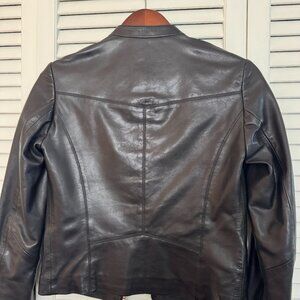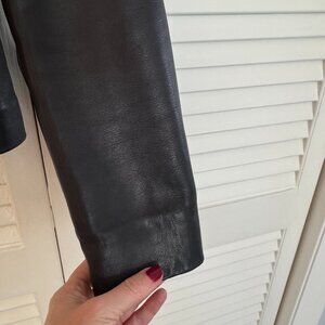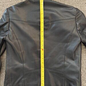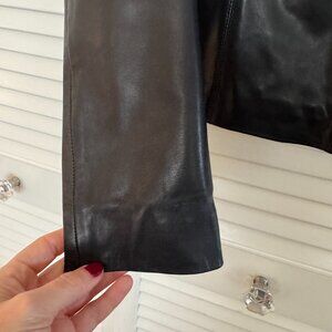 Incredibly soft black leather jacket in fantastic condition. Only signs of wear are minor creases in the cuffs that I turned in (I'm petite). Also, the zipper pull at the chest pocket has been removed. Care tag has been removed. I think the metallic zippers are gold, but they're so light that they could easily pass for silver. Comes from a non-smoking home.