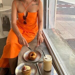 Bold orange dress with delicate straps. Ideal for a wedding guest outfit, vacation and more. Very chic.