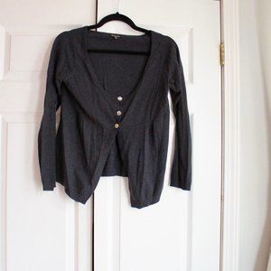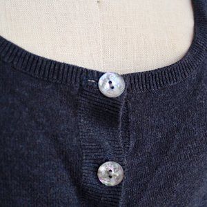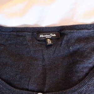 Lovely Navy Blue cardigan from Massimo Dutti. Bought in Italy many years ago. Super soft cashmere and cotton blend with and empire waits and 3 buttons. Gently used. Lots of stretch, very fitted and flattering.