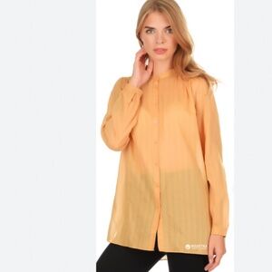 Long sleeve button down blouse. Collarless. Cotton and silk blend. Size US 12. In great condition. There is a pen dot sized stain, very minor, shown in the photos. Oversized fit.