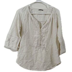 This cream blouse from Massimo Dutti features a relaxed fit and a stylish bib collar. The lightweight fabric and three-quarter sleeves make it perfect for a comfortable yet chic look. Ideal for both casual and formal settings, this top is a versatile addition to any wardrobe.
