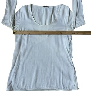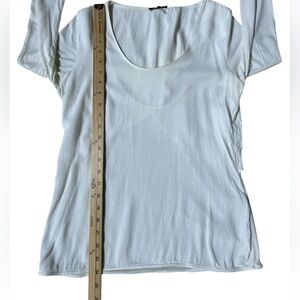 Elevate your wardrobe with this Massimo Dutti flowing blouse, crafted from 100% lyocell for a luxuriously soft feel, elegant drape, and breathable comfort. In a soft ivory hue, it features a rounded neckline, gently curved hem with soft pleat detail in back, and ¾-length sleeves for a refined yet effortless silhouette.