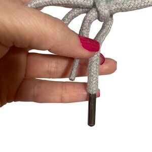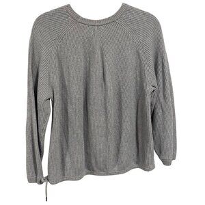 This stylish Massimo Dutti sweater features a ribbed design with a cinch waist for a flattering fit. It's a classic crewneck style in a versatile gray color, ideal for casual or semi-formal occasions. In good condition, one drawstring is missing the silver colored end cap. This medium-sized sweater offers both comfort and style.